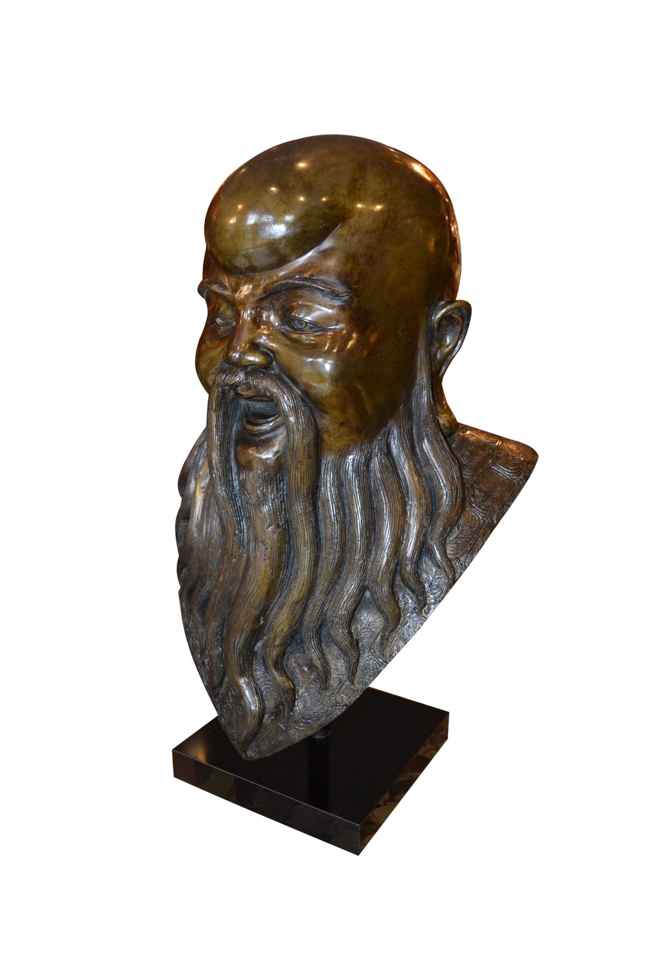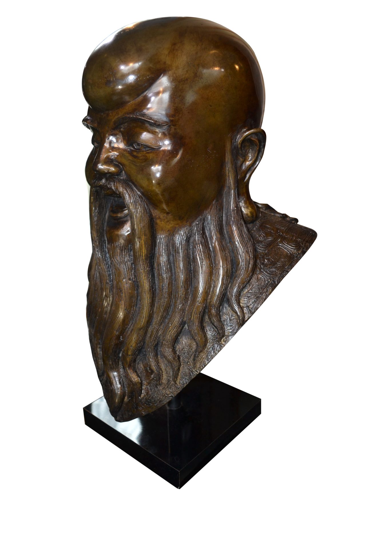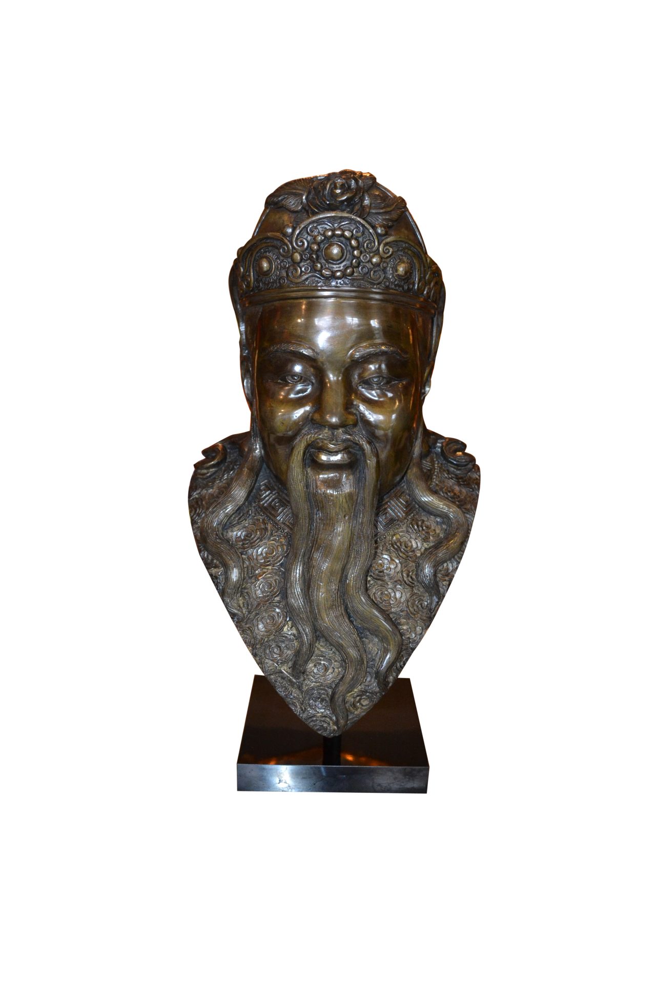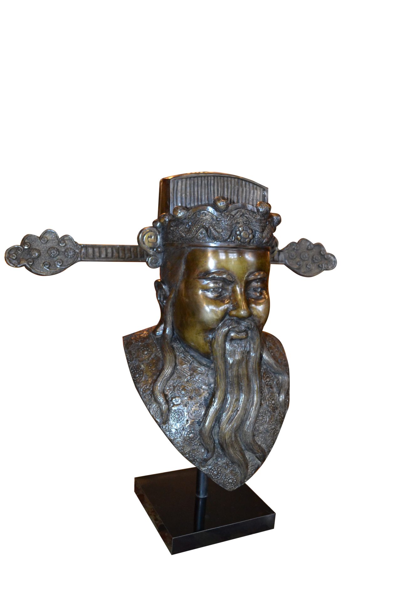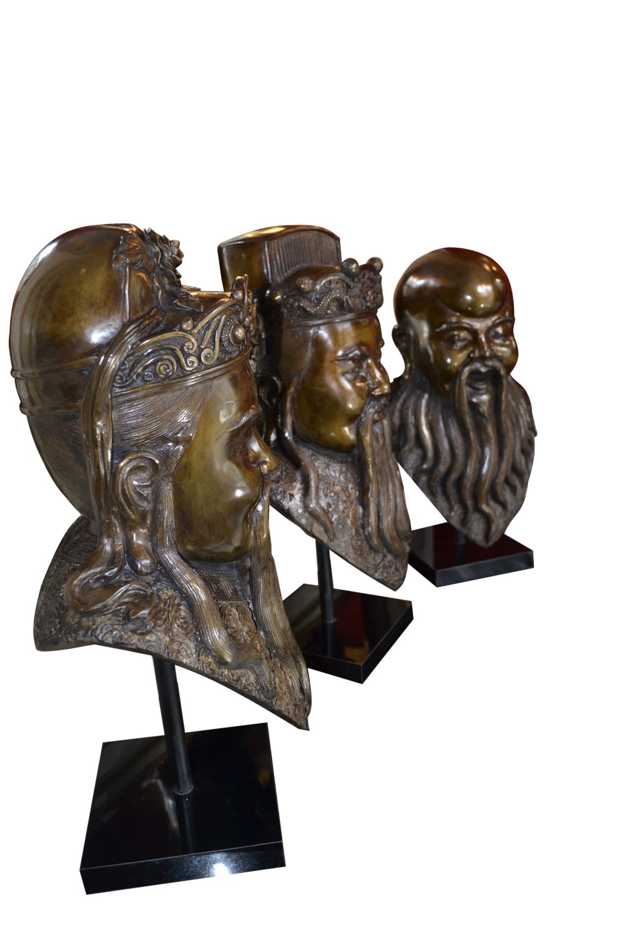 A rare complete set of three patinated bronze busts of Chinese Deities Fu, Lu, Shou (福禄寿) . three prominent gods that hold significant importance in Chinese culture and belief. The well executed busts are not signed and are supported by a metal rod on a painted wooden base.