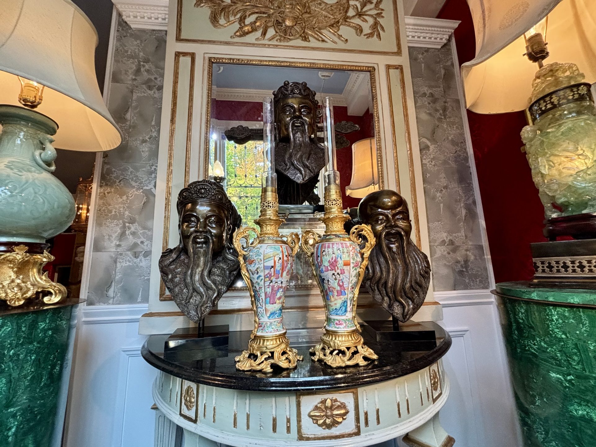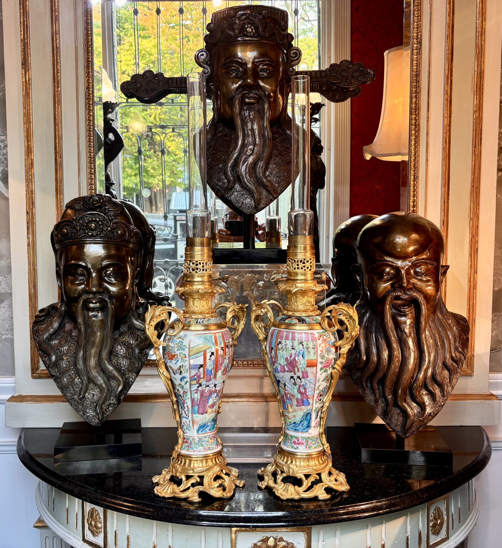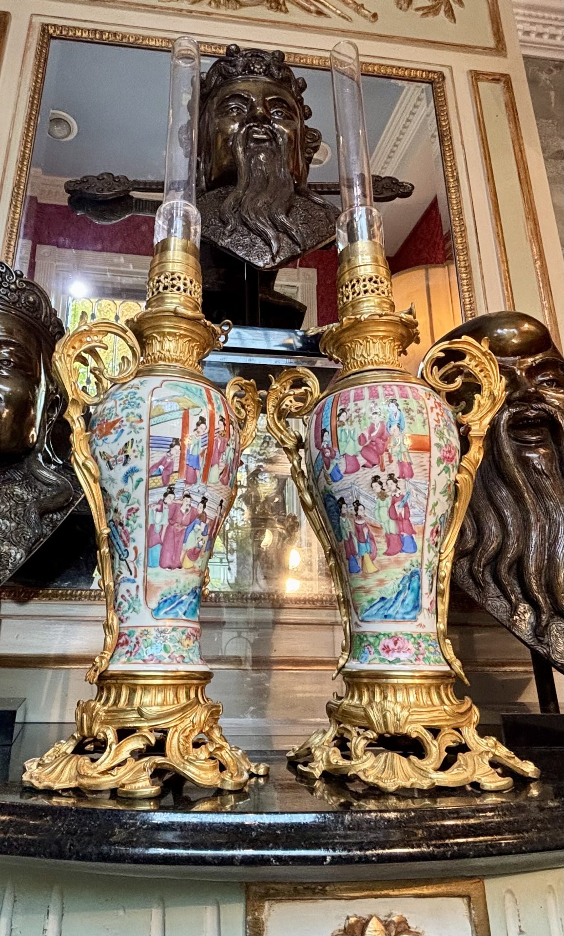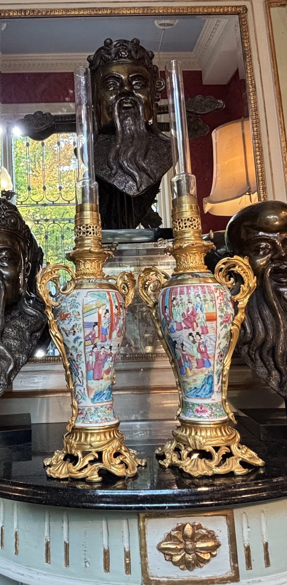 A beautiful French and Asian collaboration of a 19thC pair of Napoleon III Famille Rose porcelain, (from Canton China), and gilt bronze and brass oil lamps that miraculously include the original glass tube shades. The lamps are raised on an elegant round rococo gilt bronze base connecting to twin handled gilt bronze ‘handles’. The lovely baluster shaped body of the vases display charming hand painted scenes of personages offering gifts to the Emperor amidst finely detailed floral and foliate movements.