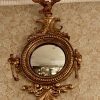 A period English Regency bull’s eye mirror in a carved and water gilt frame, the mirror is surmounted with two scrolling eagles heads which support a third complete eagle with it’s wings fully spread. The mirror has a carved decorative element on the bottom. The mirror also has it’s original side candle arms which sweep down from the middle of each side of the mirror frame. English circa 1820.