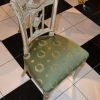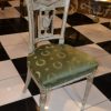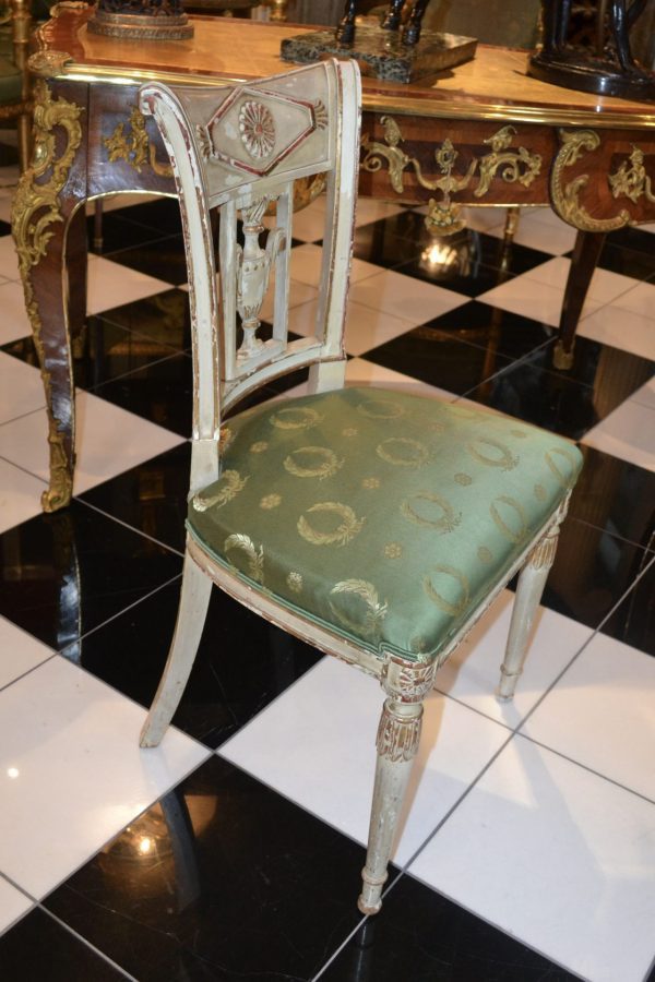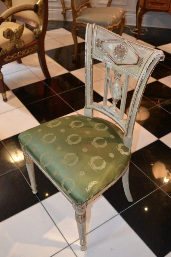 A late 18thC french side chair from the Directoire Period with a carved and parcel gilt cream painted frame. The backsplat with a carved classical urn. Upholstered in green Empire silk fabric.