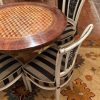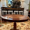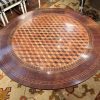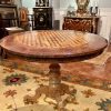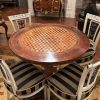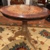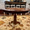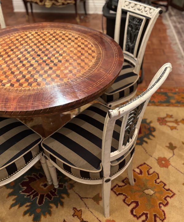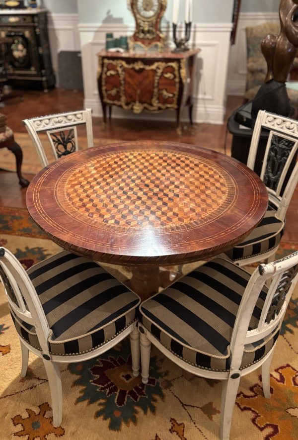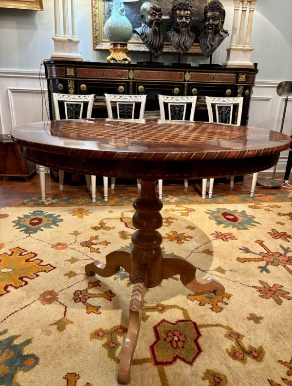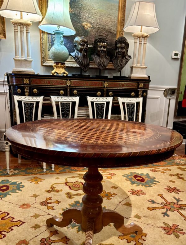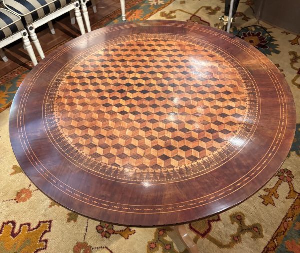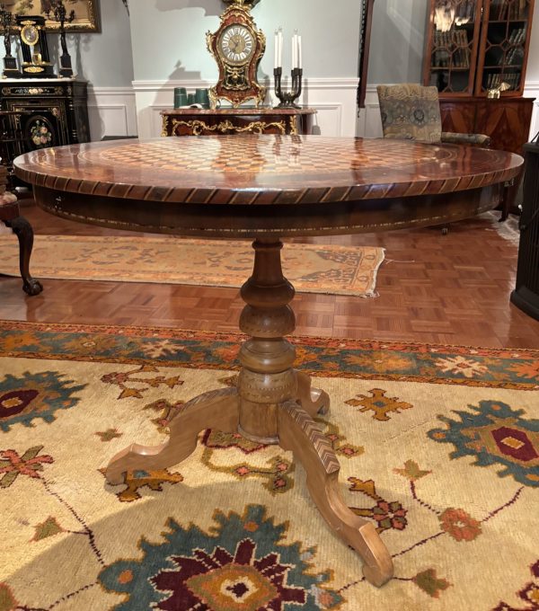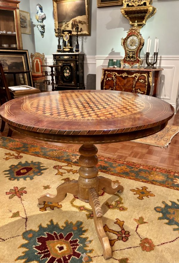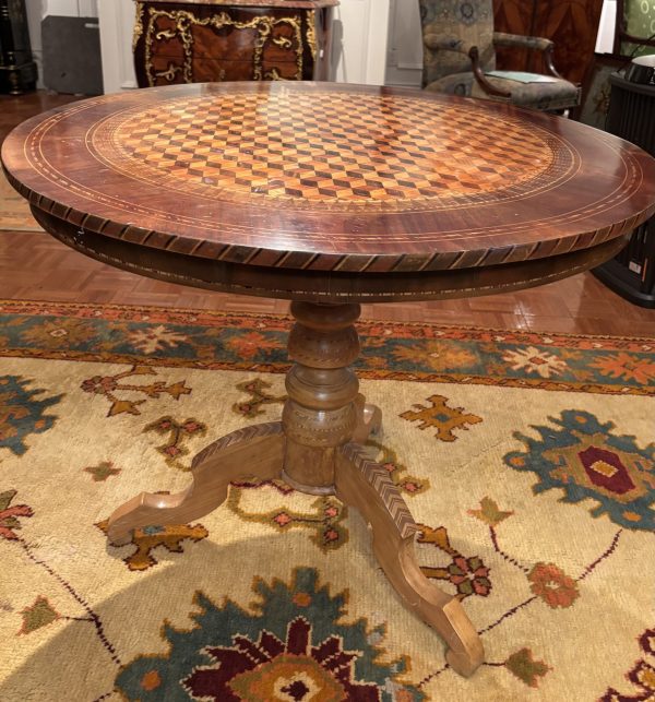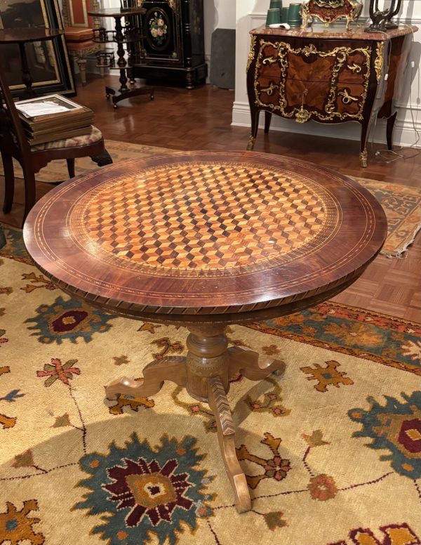 The city of Sorrento in Italy is famous for the manufacture of these types of tables, almost always constructed in walnut and typically having geometric inlay and other decorative inlay work to the top. This table is a fine example of the work done in that city from the early 19thC onward. The circular top has geometric inlay in three different woods creating an almost optical illusion of depth. The top rests on a turned inlaid column terminating in three splayed legs, also inlaid.